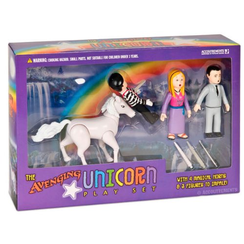 Everyone wants an imaginary unicorn friend that they can call forth to smite their enemies. The Avenging Unicorn Play Set has everything you need to use the power of the unicorn to rid your life of annoyances. Put the posable, 3-3/4" (9.5 cm) tall, hard vinyl unicorn on a flat surface and then impale one of three 3-1/8" (8 cm) tall, soft vinyl figures included (businessman/boss, new age lady and m